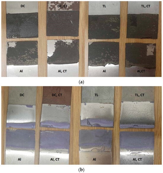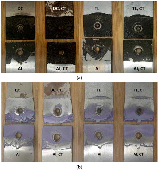 Failure modes of DC-Al and TL-Al hybrid—adhesive binding and thermal drilling joints made by (a) RB- and (b) EP-based adhesives as joined and after climate test (CT).