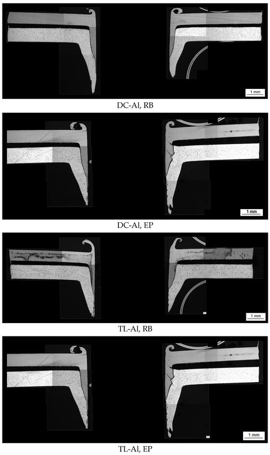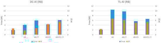 From Figure 19, it can be seen, again the same phenomenon, load capacity of the joints with RB adhesive is lower compared to the load capacity of the joints formed with EP adhesive. For both adhesives, the load carrying capacity of TL-Al joints was found to be higher compared to DC-Al joints, more manifested in joints with EP adhesive. EP adhesive is more flexible than RB adhesive, which was reflected by joint failure at higher displacement values compared to RB adhesive. The difference compared to adhesive bonded joints is visible on the downward part of the load–displacement curves (beyond Fmax), which do not point straight down, but contain a curvature caused by the failure of the bushing following the adhesive failure. The contribution of absorbed energy by the bushing failure is more visible when using RB adhesive.