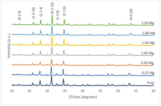 Pure and Mg-TCP XRD spectra indicating that only β-TCP phase was present. No minor or secondary phases were observed with the inclusion of Mg.