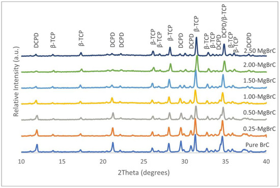 In Figure 2, the XRD spectra of pure and Mg-BrCs after 24 h of immersion in PBS at 37 °C are presented. The addition of Mg did not introduce any new phases in the Mg-BrC samples, and the only two phases of DCPD (JCPDS No. 09-0077) and β-TCP (JCPDS No. 09-0169) were found in all compositions. However, the relative peak intensity of DCPD decreased significantly with Mg addition, while no specific change in β-TCP intensity was found. The β-TCP/DCPD ratios were calculated as 1.85, 2.15, 2.03, 2.42, 6.64, 8.15, and 8.24 for pure BrC, 0.25-MgBrC, 0.50-MgBrC, 1.00-MgBrC, 1.50-MgBrC, 2.00-MgBrC, and 2.50-MgBrC, respectively.