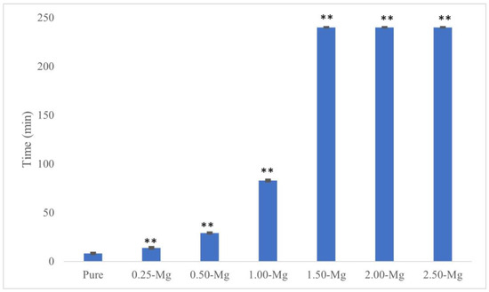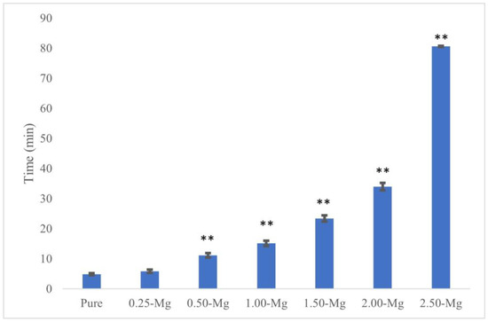 The initial and final setting times of all cements are presented in Figure 3 and Figure 4, respectively. The initial setting time for pure BrC was 4.87 ± 0.38 min. Although the addition of 0.25 wt.% Mg did not affect the initial setting time of BrC, a higher concentration of 0.50 wt.% increased it to 11.13 ± 0.7 min. The initial setting time increased with increasing Mg content and the highest time of 80.59 ± 0.17 min was found for 2.5-MgBrC. The final setting times were 8.15 ± 0.52, 13.81 ± 0.69, 28.96 ± 0.44, and 82.83 ± 0.70 min for pure BrC, 0.25-MgBrC, 0.50-MgBrC, and 1.00-MgBrC, respectively. All three of the 1.50, 2.00, and 2.50-Mg BrCs showed final setting times beyond 4 h but were not measured beyond the 4 h mark due to time constraints and the ineffectiveness of the cements for biomedical applications.