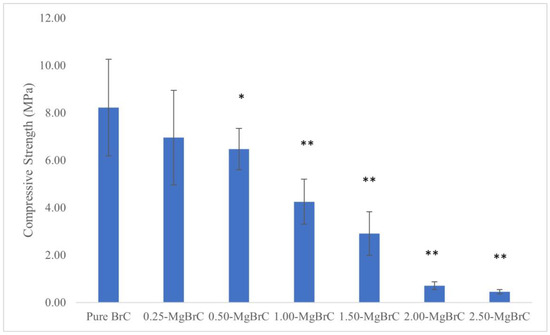The compressive strength of all BrC samples is presented in Figure 5. The addition of Mg at 0.25 wt.% resulted in an insignificant decrease in compressive strength from 8.22 ± 2.04 MPa to 6.95 ± 1.99 MPa. A higher concentration of 0.50 wt.% had a very significant impact on the reduction in compressive strength as a value of 6.47 ± 0.87 MPa (with p = 0.0081) was recorded. At higher concentrations such as 1.00 wt.% and beyond, there was an extremely significant decrease to 4.25 ± 0.95 MPa. The compressive strength values for 1.50-MgBrC, 2.00-MgBrC, and 2.50-MgBrC were 2.91 ± 0.92, 0.71 ± 0.16, and 0.45 ± 0.09 MPa, respectively (p < 0.0001).