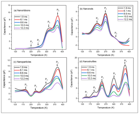 A DLTS characterization technique was applied to analyze the defect energy levels in the bandgap of the ZnO nanostructures. The majority and minority traps can be observed from the DLTS spectra. Figure 2a–d shows the individual DLTS spectra of the four different ZnO nanostructures, which are nanoribbons, nanorods, nanoparticles, and nanoshuttles. All the measurements were conducted within the 123 K to 423 K temperature range and with a 500 mV DC bias. According to our study, we noted that several defects are introduced and improved the intensity during the higher temperatures. The DLTS signal peaks provide information about the characteristics of these defects of the ZnO nanostructures (the nanoribbons, nanorods, nanoparticles, and nanoshuttles). Figure 3 shows the change in the capacitance of a ZnO/P-Si heterojunction after a pulse is applied. This change in capacitance is related to the capture of charge carriers by deep-level defects within the ZnO nanostructures at specific energy levels within the bandgap. The resulting change in capacitance is recorded as a transient signal, and the peaks in this signal correspond to different energy levels of defects. In this study, all the DLTS spectra revealed the presence of different traps related to different defects in the synthesized nanostructures. We labeled all the traps related to the four different nanostructures as P1, P2, P3, P4, and P5.
