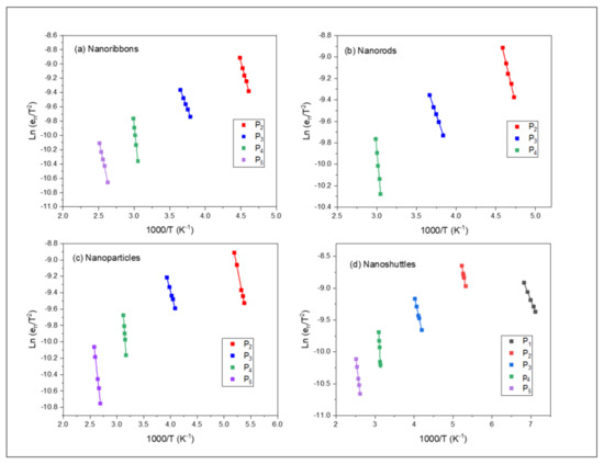 Arrhenius plots of the traps for each morphology (the nanoribbons, nanorods, nanoparticles, and nanoshuttles) are shown in Figure 3. We analyzed the defect energy levels by using Ea and , which are determined from the Arrhenius plots. By applying a variety of rate windows, the defect parameters can be obtained by using Equation (1) [37].