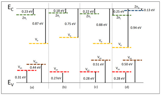 Defects are considered extremely important parameters in semiconductor devices. Any perturbation of the semiconductor lattice from the ideal structure may be called a defect, which can be either a vacancy, an impurity atom, a self-interstitial defect, or an extended defect [34]. These defects are responsible for the optical, electrical, electrochemical, mechanical, and thermodynamic properties and recombination process, which will affect the efficiency of solar cells and the stability of devices. To improve its functional properties, it is extremely important to identify the defects within each material. There are two types of defects that are intrinsic or native in addition to extrinsic defects. These defect levels are located within the bandgap of a wide-bandgap semiconductor material such as ZnO, TiO2, etc. The ZnO hexagonal close-packed structure has Zn atoms occupying half of the tetrahedral sites, and all the octahedral sites are empty. Therefore, ZnO has more opportunities to affect any perturbation. ZnO intrinsic defect energy levels originate from six main mechanisms [35,36]. The various sites for ZnO to accommodate intrinsic defects are Oxygen vacancies (Vo), Zinc vacancies (Vzn), Oxygen interstitials (Oi), Zinc interstitials (Zni), Zinc antisites (Zno), and Oxygen antisites (Ozn). In this work, the authors mainly focused on investigating, studying, and comparing these ZnO-related intrinsic defect energy levels.
