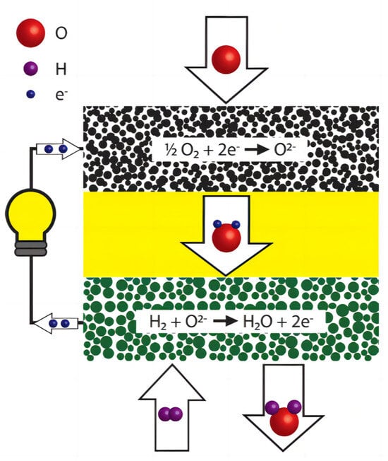 Components and working principles of an oxygen ionic SOFC. Layers from up to down: cathode, electrolyte, anode. Reprinted with permission from Ref. [36]. Copyright 2018 WIREs Energy and Environment.