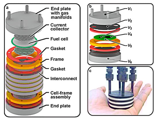 Proton-conducting ceramic fuel cell stack: (a) schematic; (b) unit-cell stack with thin metallic interconnects and internal voltage taps at key interfaces. Note that V5 is connected to the surface of the cermet anode support, while V6 is connected to the outside of the anode endplate. (c) Photo of three-cell stack. Reprinted with permission from Ref. [44]. Copyright 2021 Elsevier B.V.