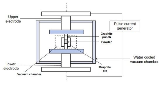 Spark plasma sintering (SPS) is an innovative sintering technology that utilizes high-energy, low-voltage pulsed current to instantly generate a discharge plasma in the local area between the particles. SPS is a promising method for obtaining solid electrolytes for PCFCs at lower temperatures (by 400–500 °C), compared to traditionally used temperature conditions [52]. For the sintering mechanism of SPS, it is generally believed that in addition to the Joule heat caused by hot-press sintering and the plastic deformation caused by pressure promoting the sintering process, the SPS process also generates a DC pulse voltage between powder particles. At the same time, it effectively utilizes the surface activation and self-heating effects generated by the discharge between powder particles. Therefore, a phenomenon unique to the SPS process that is beneficial for sintering has emerged [53]. SPS rapidly heats the materials under uniaxial pressure to produce high-density ceramics. The ability to apply very high heating and cooling rates, short residence times, and sintering at relatively low temperatures limits grain growth during densification [54]. SPS can be categorized as a low-temperature sintering technique, and the principle of discharge plasma sintering is shown in Figure 4 [55].