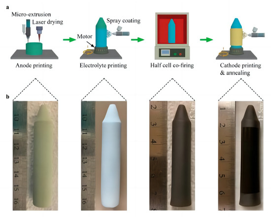 Zou et al. [83] used the L3DP to prepare a scalable tubular PCFC. The preparation process is simple and fast. This study suggested that the L3DP technique can manufacture PCFCs with high-power output and long life spans, ushering in new possibilities for commercializing scalable tubular PCFCs. Figure 8 shows the process of manufacturing a complete tubular PCFC using L3DP. Figure 8b shows a large uniform green anode tube with an outer diameter of approximately 13.5 mm and a height of approximately 73 mm, with a tapered end.