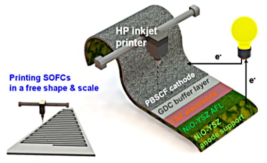 - Han, G.D.; Bae, K.; Kang, E.H.; Choi, H.J.; Shim, J.H. Inkjet printing for manufacturing solid oxide fuel cells. ACS Energy Lett. 2020, 5, 1586–1592. [Google Scholar] [CrossRef]