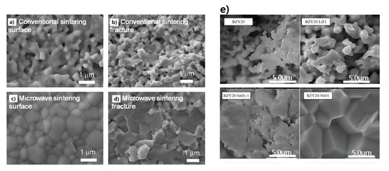 Morphologies of (a,b) conventionally sintered and (c,d) microwave-sintered BCZY membranes after the thermal treatment at 1200 °C for 2 h. Adapted with permission from Ref. [101]. Copyright 2018 Elsevier B.V. (e) Sintering aid type effect on BZY20 pellet morphology (additive amount 1 wt.%, sintering temperature 1500 °C, sintering time 24 h). Adapted with permission from Ref. [51]. Copyright 2010 Elsevier B.V.