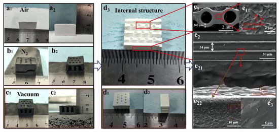 Body after debinding in (a1,a2) air, (b1,b2) N2, and (c1,c2) under vacuum conditions; (d1–d3) body after sintering; (e1,e11,e2,e21,e22,e3) microstructure of 8YSZ monoliths after sintering. Reprinted with permission from Ref. [102]. Copyright 2020 Elsevier B.V.