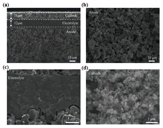 The single tube PCFC prepared using in situ 3D printing laser rapid reaction sintering technology displays a tubular BaCe0.2Zr0.7Y0.1O3−δ (BCZY27)-Ni comprising an anode support, a dense BCZY27 electrolyte film, and a porous cathode, BaCo0.4Fe0.4Zr0.1Y0.1O3−δ (BCFZY0.1). The well-controlled microstructure of the PCFC is shown in Figure 14a–d. The porous anode support exhibits a uniform and defect-free microstructure with a pore size of several micrometers. The electrolyte is uniform and dense, without visible pinholes or cracks, and adheres well to the porous electrode without exfoliation. The cathode has a fine porosity and nanoscale grains, which facilitate rapid gas transport and a large number of three-phase boundary positions, resulting in excellent electrochemical performance [83].