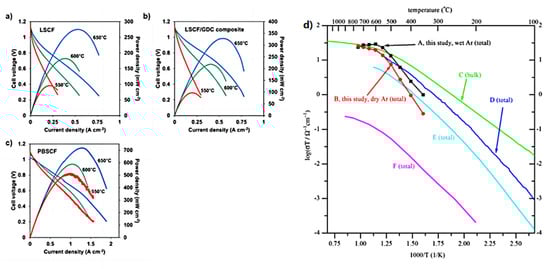 Artem Tarutiet al. [39] reported a one-step fabrication of PCFCs using a convenient tape calendering method. The electrochemical impedance spectroscopy (EIS) results presented in Figure 15a,b indicate that the spectra have different shapes depending on the measurement temperatures and/or cell bias. In detail, at least three parts (described by RQ elements, where R is the resistance, Q is the constant phase element) can be clearly distinguished at low temperatures; these merge to enable the detection of at least two (low- and high-frequency) processes at higher temperatures.