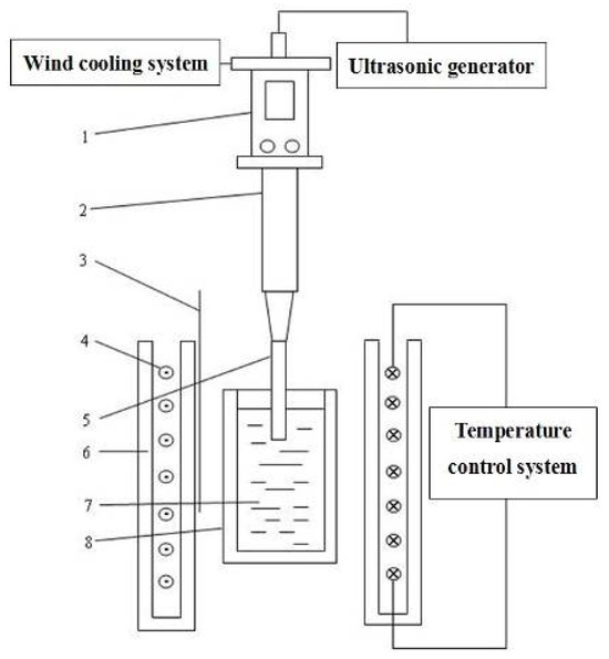 Figure 1. Experiment apparatus of ultrasonic treatment: 1—ultrasonic transducer; 2—amplitude transformer; 3—thermocouple; 4—resistance heater; 5—ultrasonic radiator; 6—ceramic tube; 7—alloy melt; 8—crucible.