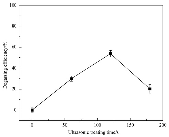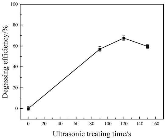 Figure 5. Effect of ultrasonic treatment time on the degassing efficiency of the Mg-6Zn-1Ca alloy.
