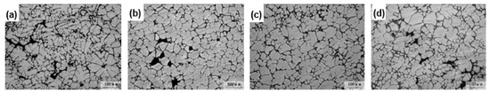 Figure 4 illustrates the microstructure of the ingots after different treatment times at 700 °C with an ultrasonic power of 150 W. In the untreated ingot (Figure 4a), the solidification structure of the alloy appears as coarse and uneven dendrites with numerous inter-dendritic pores. After 60 s of ultrasonic treatment (Figure 4b), the grains become more refined and rounded, but a significant number of pores are still visible. When the treatment time reaches 120 s, the grain size slightly coarsens, but the density of the ingot reaches its maximum and the microstructure in the center of the ingot becomes denser. However, as the treatment time is further increased to 180 s, the number of pores in the ingot gradually increases (Figure 4d).