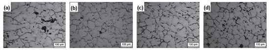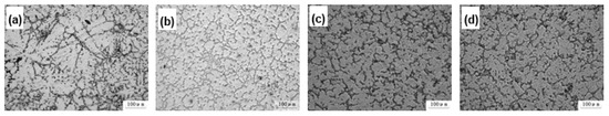 Figure 6. Microstructures of the Mg-6Zn-1Ca alloy treated with different ultrasonic treatment times: (a) 0 s; (b) 90 s; (c) 120 s; (d) 150 s.