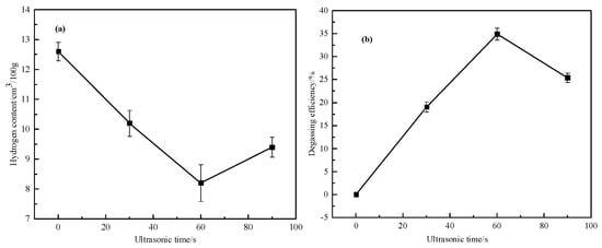 Figure 7. Effect of ultrasonic treating time on hydrogen content and degassing efficiency of the AZ80 alloy: (a) hydrogen content; (b) degassing efficiency.