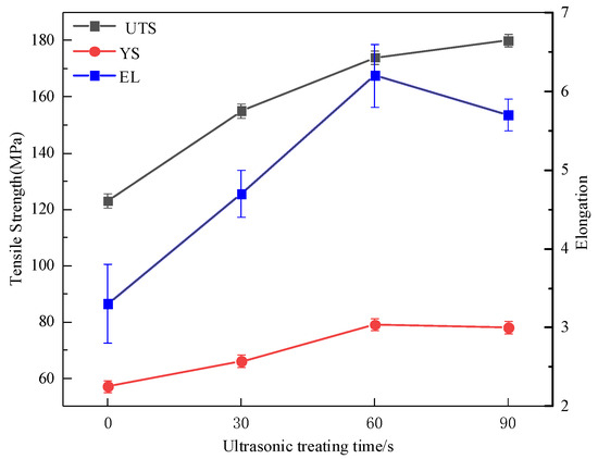 Figure 11. Effect of ultrasonic time on the mechanical properties of the AZ80 alloy.