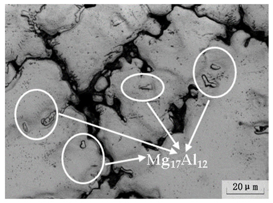 The XRD results showed that the AZ80 alloy was only α-Mg and Mg17Al12 phases, as shown in Figure 9. The morphology of the β-Mg17A112 phase directly influences the mechanical properties of the alloy. Figure 10a shows the microstructure of the AZ80 alloy without ultrasonic treatment, which contains a large amount of skeletal or chunky β-Mg17A112 eutectic compounds, mainly distributed in a continuous network pattern along the grain boundaries. After 60 s of ultrasonic treatment, the continuous network of β-Mg17A112 phase becomes discontinuous and finely dispersed.