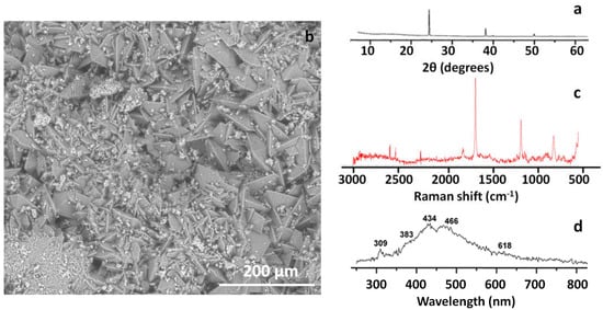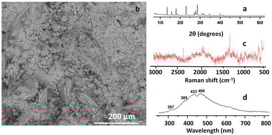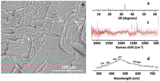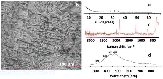 Uric acid is a purine derivative (with a double ring containing carboxylic, amine and ketone groups) that crystallizes in the monoclinic crystallographic system in long acicular crystals (prismatic class 2/m). The structure is formed by molecules of aromatic compounds with a flat morphology that join together through hydrogen bonds, generating a very fine, lamellar structure that, morphologically, is identified with characteristic and very sharp acicular crystals [42]. The very high diffraction peaks are 3.093 Å, 3.087 Å, 4.91 Å and 3.864 Å (Figure 3a). Its morphology has the appearance of interconnected prismatic crystals, like those in Figure 3b, with the Raman and CL spectroscopy results (Figure 3c,d) being like those described by Iordanidis et al. [43].