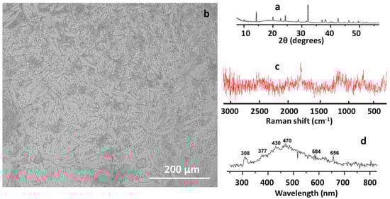 By XRD analysis, it presented peaks at 5.601 Å, 4.257 Å, 2.919 Å and 2.690 Å (Figure 6a), as described by Whitaker and Jeffery [55], and Ye et al. [56]. Its morphology, by SEM/EDX analysis, frequently offers an orthorhombic pyramid appearance (Figure 6b), indicating very favorable crystallization conditions. The Raman spectra are in Figure 6c) and the peaks are the same as those described by Stefov et al. [50]. CL bands are in Figure 6d). Struvite is a phosphate that generates great disposal problems in the fecal waters of large cities due to its expensive treatment and use as waste [53].