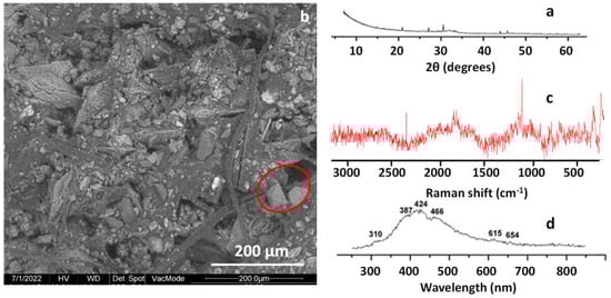 Struvite: (a) X-ray microdiffraction analysis, (b) SEM/EDX analysis (crystal orthorhombic pyramidal; the red circle corresponds to struvite crystals), (c) Raman analysis, (d) CL analysis.