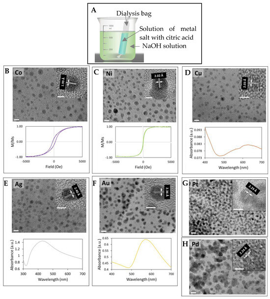 The chemicals including cobalt (II) chloride hexahydrate (CoCl2·6H2O, 98%), nickel (II) chloride hexahydrate (NiCl2·6H2O, 98%), copper(II) chloride dihydrate (CuCl2·2H2O ≥ 99.0%), silver nitrate (AgNO3, 99%), gold (III) chloride trihydrate (HAuCl4·3H2O, 99.9%), platinum (II) chloride (PtCl2, 98%), palladium (II) chloride (PdCl2, 99%), cerium (II) chloride heptahydrate (CeCl2·7H2O, 99.9%), citric acid (C6H8O7, 99.5%), and dialysis tubing cellulose membrane (MWCO 14000) were purchased from Sigma-Aldrich (St. Louis, MO, USA). Furthermore, copper (II) chloride dihydrate (CuCl2·2H2O, 99%) was obtained from Alfa Aesar (Ward Hill, MA, USA) and sodium hydroxide (NaOH, 97%) was purchased from Thermo Fisher Scientific (Waltham, MA, USA). All aqueous solutions were prepared in Millipore Milli-Q DI water (18 MΩ cm) which was provided from a Millipore Gradient Milli-Q water system (Billerica, MA, USA).