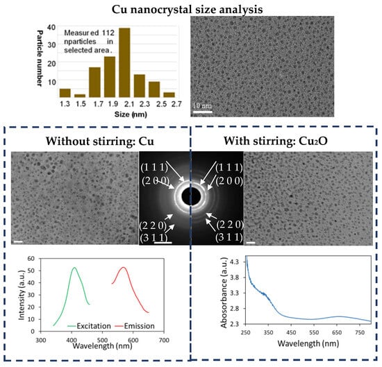 The diffusion process of OH− ions controls the formation of Cu or Cu2O nanoparticles. Cu2O and Cu nanoparticles are produced using an identical synthesis process with and without stirring in the dialysis bag, respectively. Cu nanocrystals have a size about 2 nm and are fluorescent. Cu2O particles suspension showed its typical UV-Vis absorption spectrum. The scale bars of TEM micrographs and SAED pattern are 10 nm and 5 nm−1, respectively.