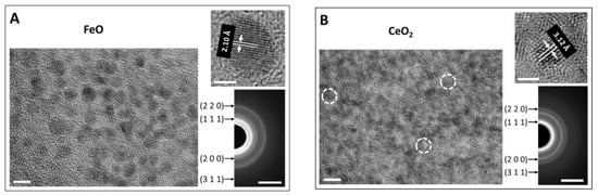 Synthesized ultrasmall oxide nanoparticles. FeO (A) and CeO2 (B) nanoparticles were synthesized with 1.5 mM FeCl3 and CeCl3 salt and 1.5 mM citric acid in the dialysis bag with vigorous stirring, respectively, and 0.5 M NaOH in the reservoir. The scale bars of TEM micrographs corresponding to nanoparticles distribution, lattice fringes, and SAED pattern are 5 nm, 2 nm, and 5 nm−1, respectively.