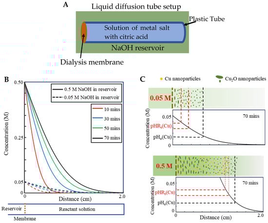 where is the distance from the surface, is the time, the surface concentration, is the initial concentration in the solution, is the diffusivity, and stands for error function [26]. By taking , and [27], the concentration profiles of OH− ions in the solution from a reservoir containing 0.05 M () and 0.5 M () NaOH solution, calculated using Equation (1), are plotted in Figure 5C, respectively. When 0.05 M NaOH solution is used, a gradual pH gradient results in a slower rate of pH change in the solution, so a large volume of the solution experiences a pH below pHRr(Cu) but above pHo(Cu) for a long time, in which only the oxide precipitation reaction takes place and ultrasmall oxide nanoparticles form. When 0.5 M NaOH solution is used, a steep pH gradient makes pHRr(Cu) quickly sweep through the whole solution and the solution experiences a pH below pHRr(Cu) for a much shorter period of time, subsequently forming a larger fraction of metal nanoparticles [55].