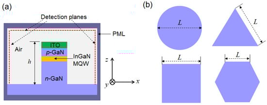 (a) A schematic side view of the finite-difference time-domain (FDTD) computational domain for the nanorod LED structure; (b) Cross-sectional shapes in the x-y plane for the four simulated nanorod LED structures: circle, square, equilateral triangle, and regular hexagon. The diameter of the circle and the side lengths of the equilateral triangle, square, and regular hexagon are denoted as L.