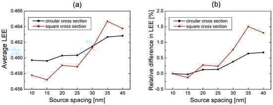 As the number of source points increases, the accuracy of simulation results will be improved at the cost of a longer simulation time. We first investigated the dependence of LEE on the dipole source spacing. LEE was simulated as the source spacing for the circular and square cross sections. Figure 3 shows the average LEE calculated using Equation (2) for circular and square cross sections with D of 500 nm. The LEE increased only slightly with increasing source spacing. As the source spacing increased from 10 to 40 nm, the average LEE increased relatively by ~0.7% and ~1.5% for the circular and square cross sections, respectively. When the source spacing was 25 nm, the relative increases in LEE for the circular and square cross sections were less than 0.2% and 0.3%, respectively. Thus, when the source spacing is 25 nm, the numerical error due to the source spacing is almost negligible, so we chose the spacing to be 25 nm for simulations of this study.