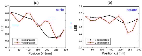 Light-extraction efficiency (LEE) is shown as a function of the source position in the x direction for the dipole source polarized in the x and y directions. (a) Circular cross section with a diameter of 0.6 μm; (b) Square cross section with a side length of 0.6 μm.