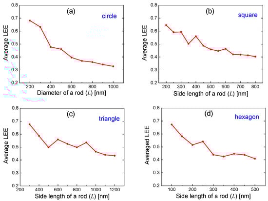Using the source position- and polarization-dependent LEE data in Figure 4 and Equation (2), the LEE averaged over source positions and polarization directions can be obtained. In Figure 5, the average LEE is plotted as a function of L for the circular, square, triangular, and hexagonal cross sections. The average LEE tends to decrease in all cross-sectional features with increasing L. In simulated nanorod LED structures, light is mainly extracted into the air through the sidewall surface because the rod height h is much longer than L. As L increases, the sidewall surface area increases linearly with L, while the floor area adjacent to the substrate increases quadratically with L. Therefore, as L increases, the LEE to the air will decrease, while the portion of light exiting to the substrate direction will increase. It can be seen that the circular cross section shows a more rapid decrease in average LEE than other cross sections, which can be attributed to the strong coupling of WGMs in the circular cross section, as shown in Figure 4. However, it may be inappropriate to compare LEEs between different cross-sectional shapes for the same L value. Instead, comparing LEEs for the same cross-sectional areas would be fair.