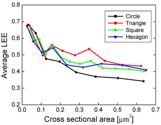 The average LEE is plotted as a function of cross-sectional area (A) for the circular, triangular, square, and hexagonal cross sections.