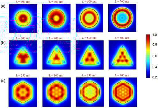 Figure 7 shows the electric field intensity profiles in the plane of QWs for circular, triangular, and hexagonal cross-sectional shapes with various L values. The intensity profiles were averaged over SPD, polarizations, and source positions as in the calculation of the average LEE. For circular cross sections, both WGM and Fabry–Perot radial modes are observed. A strong electric field intensity around the circular boundary corresponds to the WGMs. As L increases, the electric field intensity near the central region inside the rod was reduced relative to that of the circular rim, implying that the influence of WGMs becomes stronger with increasing diameter. In Figure 7b,c, electric field profiles with triangular and hexagonal symmetries are observed for triangular and hexagonal cross sections, respectively. In both triangular and hexagonal cross sections, relatively high intensities are observed near the boundaries of the nanorods, similar to the WGM of circular nanorods. However, the electric field intensity decreased significantly near the vertices of the triangular and hexagonal cross sections, which is distinct from the WGM of the circular nanorods.