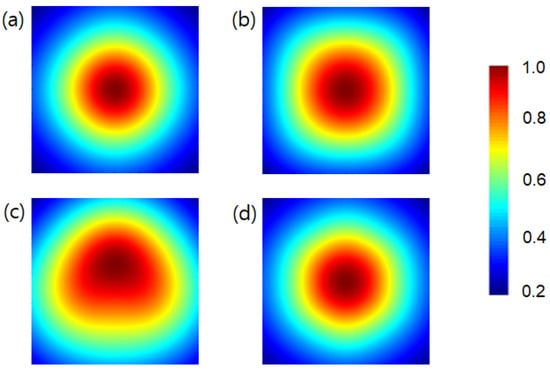 The near-field electric-field intensity profiles above the nanorod LED structure for cross sections of (a) circular, (b) square, (c) triangular, and (d) hexagonal shapes with L of 400 nm. For each cross section, the emission profile is averaged over spectrum, polarization, and source positions. The color scale bar for relative intensity is shown on the right.