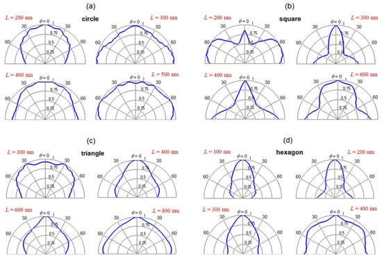 The polar plot of far-field patterns (FFPs) for different cross-sectional shapes and sizes. In this polar plot, FFP in the vertical direction corresponds to the polar angle θ of 0. (a) Circular cross sections for L of 200, 300, 400, and 500 nm; (b) Square cross sections for L of 200, 300, 400, and 600 nm; (c) Triangular cross sections for L of 300, 400, 600, and 800 nm; (d) Hexagonal cross sections for L of 100, 200, 300, and 400 nm.