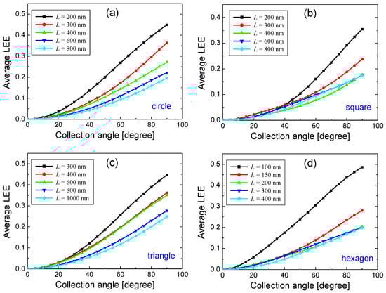 Average LEE within a collection angle (θc) for (a) circular, (b) square, (c) triangular, and (d) hexagonal cross sections.