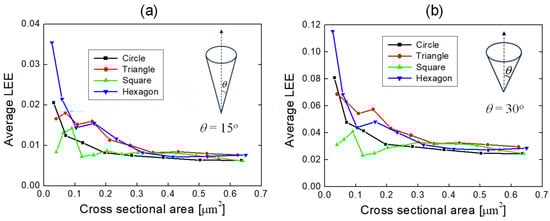LEE within a collection angle (θc) as a function of cross-sectional area for the circular, triangular, square, and hexagonal nanorods. (a) θc = 15°; (b) θc = 30°.