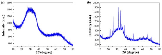 Figure 1a,b show the XRD patterns of glass additives ZBS1 and ZBS2, respectively. It can be observed that the XRD results for ZBS1 exhibit no significant peaks, indicating no appearance of crystallization and confirming the completion of glass fabrication, while ZBS2 shows crystallization. As the ZnO content in the glass system increases, the crystallization temperature of the glass tends to decrease. In addition, ZnO can facilitate grain nucleation and make glass susceptible to crystallization. Therefore, for the subsequent research, the ZBS1 glass was chosen for addition into the BT-BMN ceramics. The properties of this ZBS1 glass are shown in Table 1.