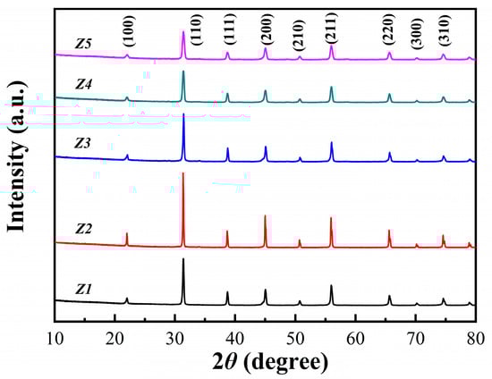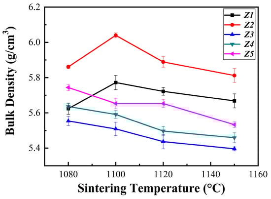 The effect of sintering temperature on bulk density in the glass-added BT-BMN ceramics is shown in Figure 2. It can be observed that the bulk densities of the Z1 and Z2 samples exhibit an initial increase followed by a decrease with increases in the sintering temperature, while the Z3, Z4, and Z5 samples exhibit an overall decreasing trend in their bulk densities with the increasing sintering temperature. The sintering temperature required to achieve maximum bulk density is 1100 °C for the Z1 and Z2 samples, whereas this decreases to 1080 °C for the Z3, Z4, and Z5 samples. With increases in the glass additive content, the optimal sintering temperature shows a decreasing trend. Due to the low melting point of ZBS, when the temperature reaches 700 °C, the ZBS glass begins to soften and forms a liquid phase as the sintering temperature rises. The formation of a liquid phase in the sintering process can reduce the sintering activation energy, which can promote material transformation during sintering and the densification of ceramics; this consequently improves the density and refines the grain size, resulting in enhanced energy storage performance [24,25].