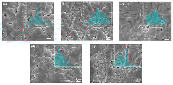 SEM micrographs of the glass-added BT-BMN ceramics: (a) x = 2, Z1; (b) x = 4, Z2; (c) x = 6, Z3; (d) x = 8, Z4; (e) x = 10, Z5. The insets show the grain size distributions in the ceramics.