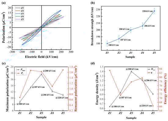 where E is the applied electric field, Pmax is the maximum polarization, and Pr is the remanent polarization. The energy storage efficiency ƞ is expressed as ƞ = . The BDS of glass-added ceramics increases with the addition of ZBS1 glass, as shown in Figure 6b. The microstructure of the materials, including porosity, grain density, and grain size, is an important influence factor for the BDS of ceramics. Microstructure analysis indicates that the enhancement in BDS is mainly due to the fact that the ZBS1 addition can refine the grains and make the grains distribute uniformly. Despite the lower relative density and higher porosity of Z5 compared to Z3 and Z4, the reduction in grain size contributes to increased grain boundaries, which increases the resistance and provides additional dislocation, leading to more efficient charge trapping and dissipation, and thereby enhancing breakdown strength. This dominant effect in enhancing the BDS of ceramics results in the highest BDS being observed in the Z5 sample, reaching 228 kV/cm. The maximum W and Wrec (1.77 J/cm3 and 1.39 J/cm3, respectively) are obtained when x = 6, the same trend as the Pmax, indicating that the energy density is mainly dominated by polarization. The Pmax of the Z3 sample reaches 17.65 µC/cm2, representing a 6.6% increase compared to the pure BT-BMN [14]. The Z5 sample exhibits the highest BDS but its Pmax is low and Pr is high, resulting in a relatively low energy storage density. Among all of the measured samples, Z3 has the highest Wrec at 1.39 J/cm3, with an ideal ƞ of 78.3%, showing excellent energy storage performance. The increased energy density of these glass-added BT-BMN ceramics can be attributed to the fact that the addition of an appropriate amount of ZBS1 glass refines the microstructure of ceramics, resulting in an increase in the BDS and enhancing the polarization behavior of the ceramics.
