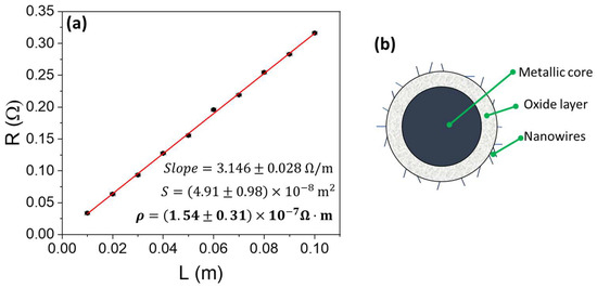 Prior to inducing the oxidation of the metallic wires, characterization of the electrical resistivity has been performed. The variation of the resistance (R) with length (L) of the wire is determined using a 4-point probe configuration, and the data are plotted in Figure 2a.