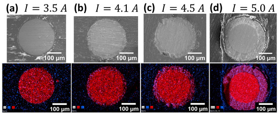 Evolution of Nb2O5 oxide layer with current value of (a) 3.5 A; (b) 4.1 A; (c) 4.5 A; and (d) 5.0 A (t = 60 s). EDX maps show the distribution of Niobium (red) and Oxygen (cyan).