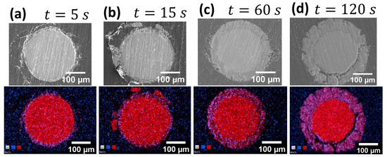 Evolution of Nb2O5 oxide layer with time (a) 5 s; (b) 15 s; (c) 60 s; and (d) 120 s (I = 4.8 A). EDX maps show the distribution of Niobium (red) and Oxygen (cyan).