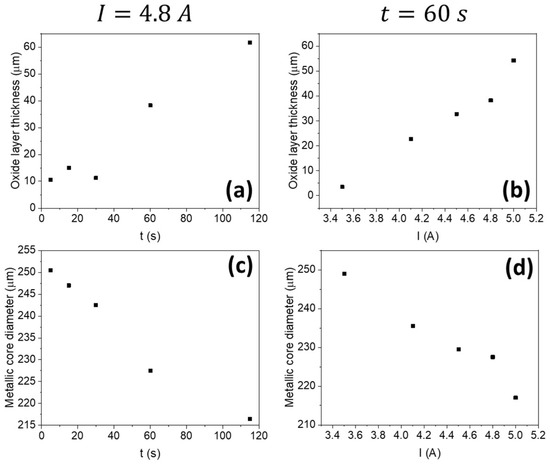Plot of the evolution of the mean value of the oxide layer thickness (a) and the metallic core diameter (c) with time, for a fixed current of 4.8 A. In (b,d), the evolution is shown in terms of current for a fixed time value of 60 s.